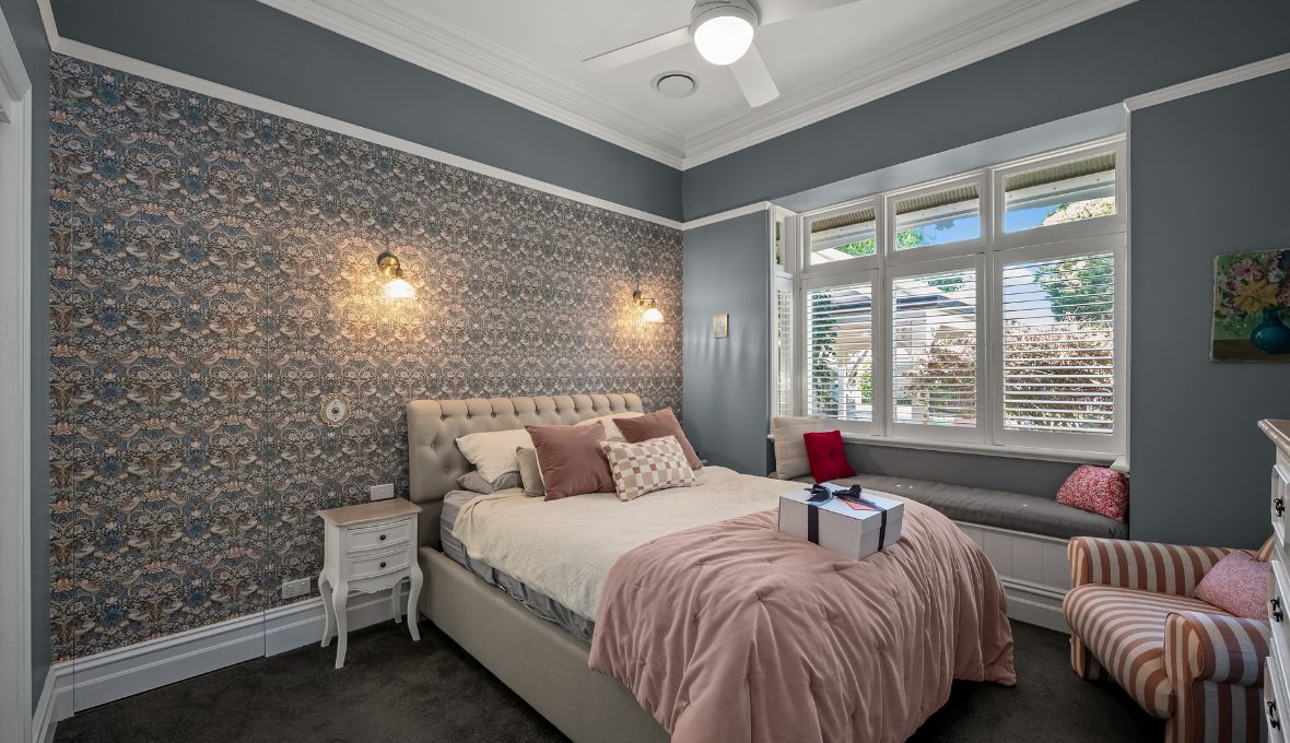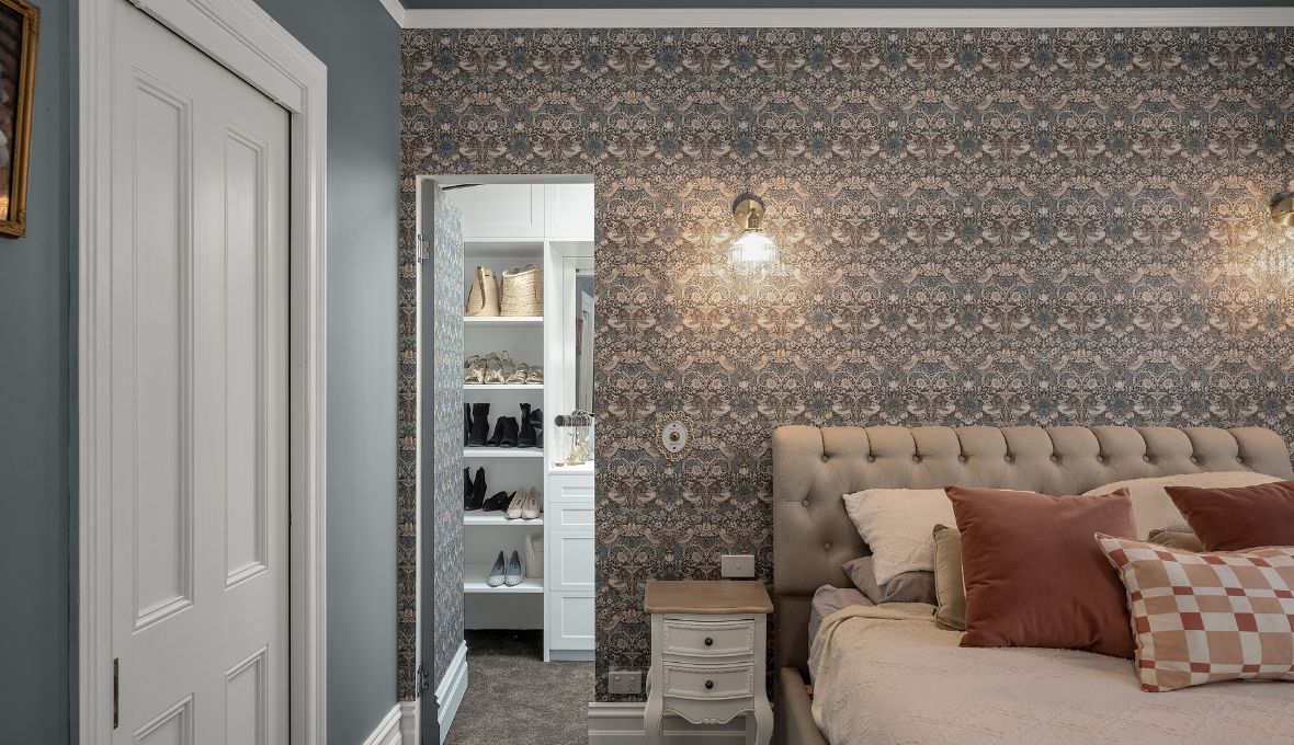 The new walk-in wardrobe is bright, beautiful, and full of character. The skylight allows natural light to enter during the day, while the LED lighting creates a soft glow at night. The wallpapered door cleverly conceals the entry, and the “Press for Champagne” button adds a touch of fun and luxury.